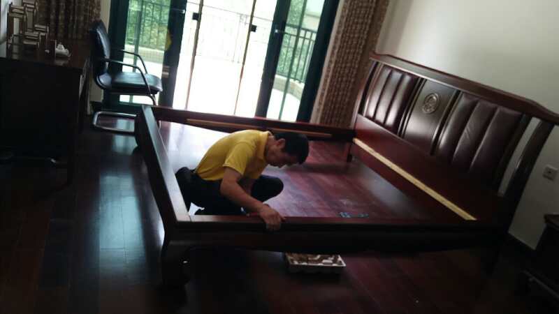 8、床頭柜拆取下業(yè)的螺絲零件裝塑膠袋里封口,用雙面膠在床頭板粘住,以免遺落。