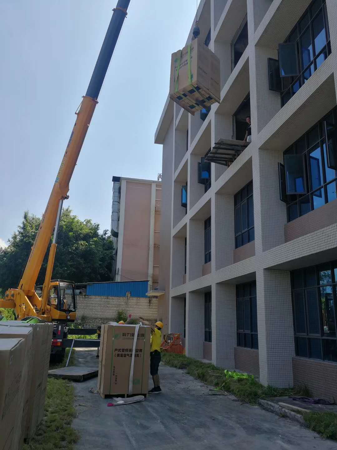 勘查完畢后確認(rèn)可以從陽臺或窗戶可以進(jìn),外墻無障礙就可以開始把電動設(shè)備組裝好,吊臂伸出陽臺窗口把鋼絲繩和吊鉤放到一樓地面,開始包裝家具沙發(fā)、扎繩索、用吊鉤掛好家具沙發(fā)上的繩索,然后再綁上兩根安全牽引繩(下面讓兩個工人拉,防止家具沙發(fā)碰到樓房外墻壁),樓上就可以插好電源啟動電動吊機(jī)往上吊家具沙發(fā)上樓了。