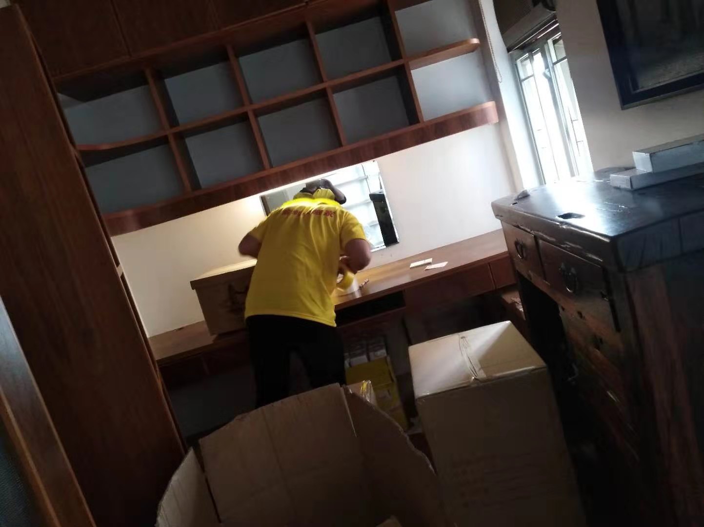 十二、柜子:搬柜子必須把門銷銷上,把抽屜鎖好,是用繩子先“打圍”,捆綁上兩圈,保護家具的柜子門與抽屜,以免在轉(zhuǎn)移過程中因傾斜而將其甩出、 摔壞。搬柜子的人,應(yīng)在其兩邊站立,一側(cè)的人搬柜頂部,另一側(cè)的人抬柜下腳,使柜子側(cè)傾,與地面呈45°角。這樣較為省力,便于跋涉通過,也比較安全,是 熟行搬法。