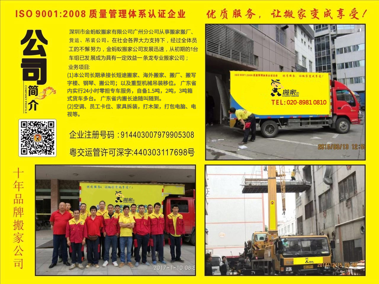 深圳市金螞蟻搬家有限公司(注冊資金1000萬,企業(yè)注冊號碼:440301103011399;國稅字:440300797990530號;粵交運管許可深字:440303117698號)是深圳市一家從事的搬屋公司。成立于1995年,是深圳市成立較早的深圳搬家公司、深圳搬運公司之一。在社會各界大力支持下,經(jīng)過全體員工的不懈努力,我司搬家發(fā)展迅速,從初期的幾個車組已發(fā)展成為具有一定效益一條龍深圳搬家公司,所有員工均受過系統(tǒng)培訓。